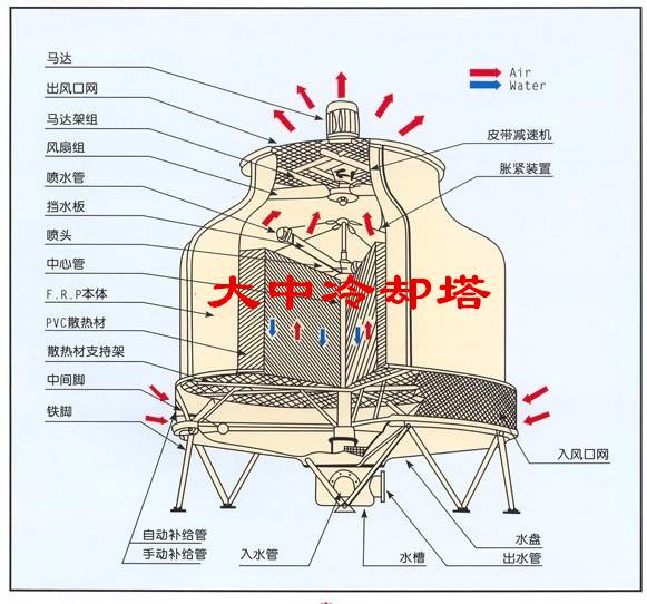 圓形逆流式玻璃鋼冷卻塔采用逆流式氣熱交換技術,填料采用優質的改性聚氯 乙波片,以擴散淋水面積;通過旋轉布水方式,實現布水均勻,增強冷卻效果。我廠曾對本系列產品的外形設計作過局部改進,使其更加運行可靠、耐用、裝配方便.